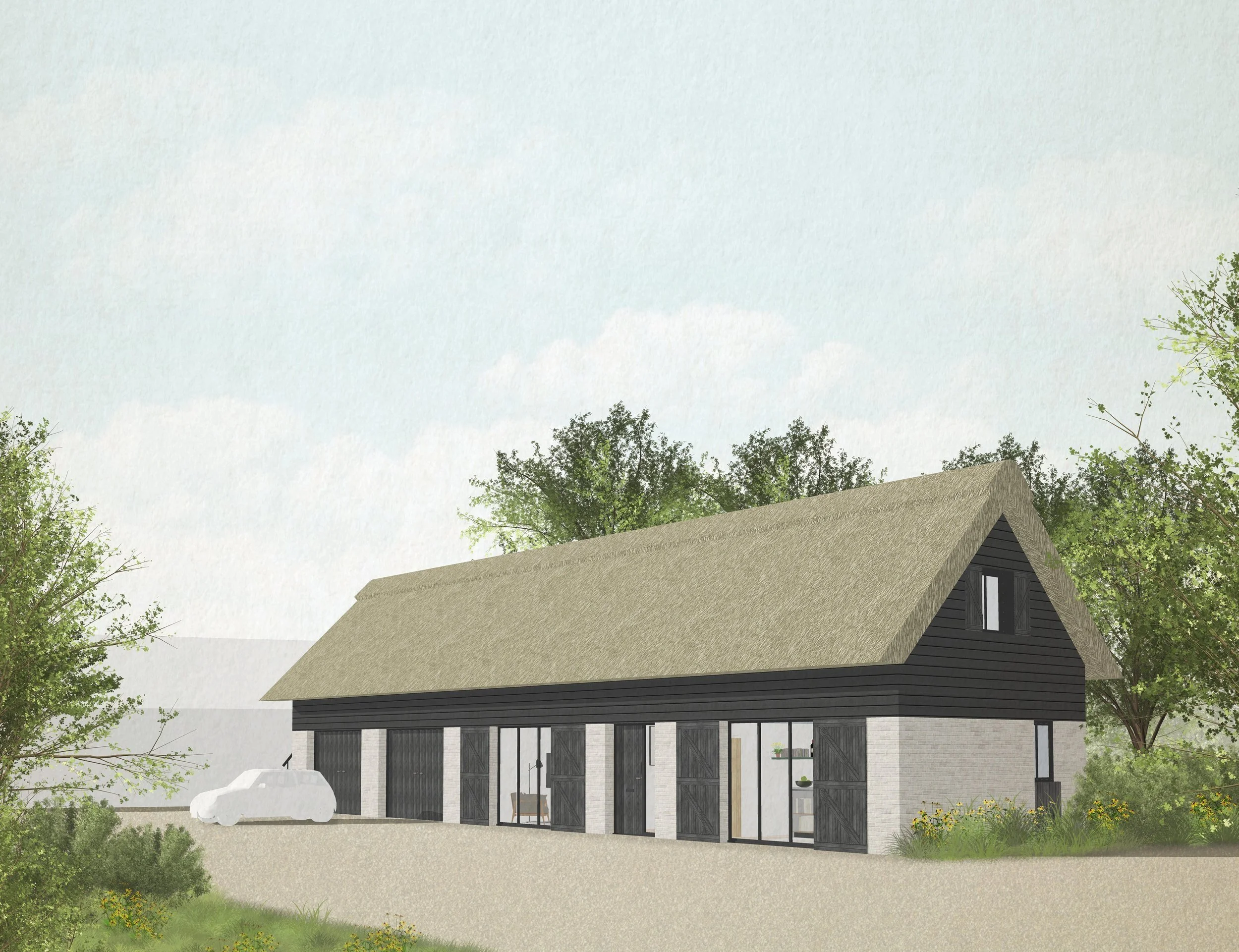 An historic aerial photo informed the black weatherboard, referencing its original material. The thatch roof is nod to the larger, now destroyed, neighbouring barns.